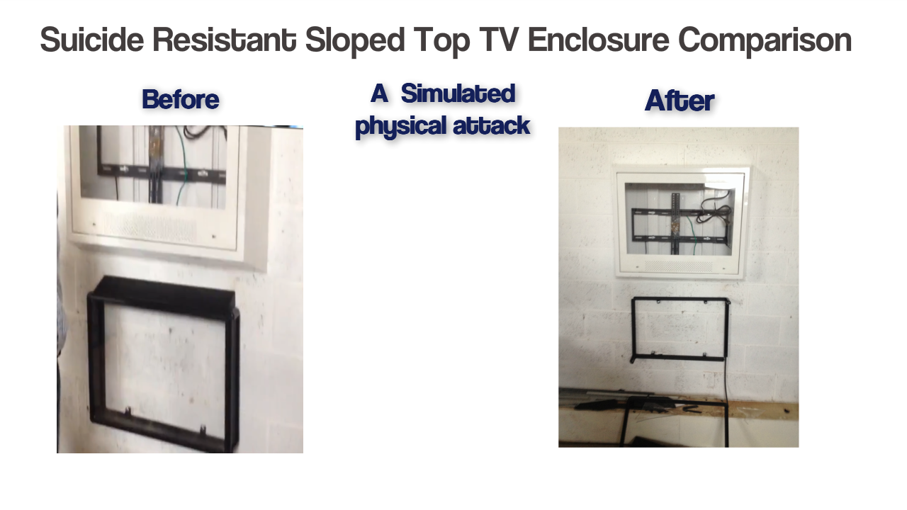 ProEnc makes very strong TV boxes with sloped sides. They are used in mental health hospitals to help keep patients safe and stop them from hurting themselves.